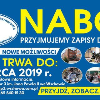 Dyrektor Szkoły Podstawowej nr 3 im. Jana Pawła II we Wschowie informuje, że od 11 marca do 29 marca 2019 r. , trwają zapisy do szkoły na rok szkolny 2019/2020 do klas 1-8. Zapisu dziecka można dokonać w sekretariacie szkoły, w godzinach od 7.00 – 15.30. Dokumenty do pobrania są dostępne poniżej lub...